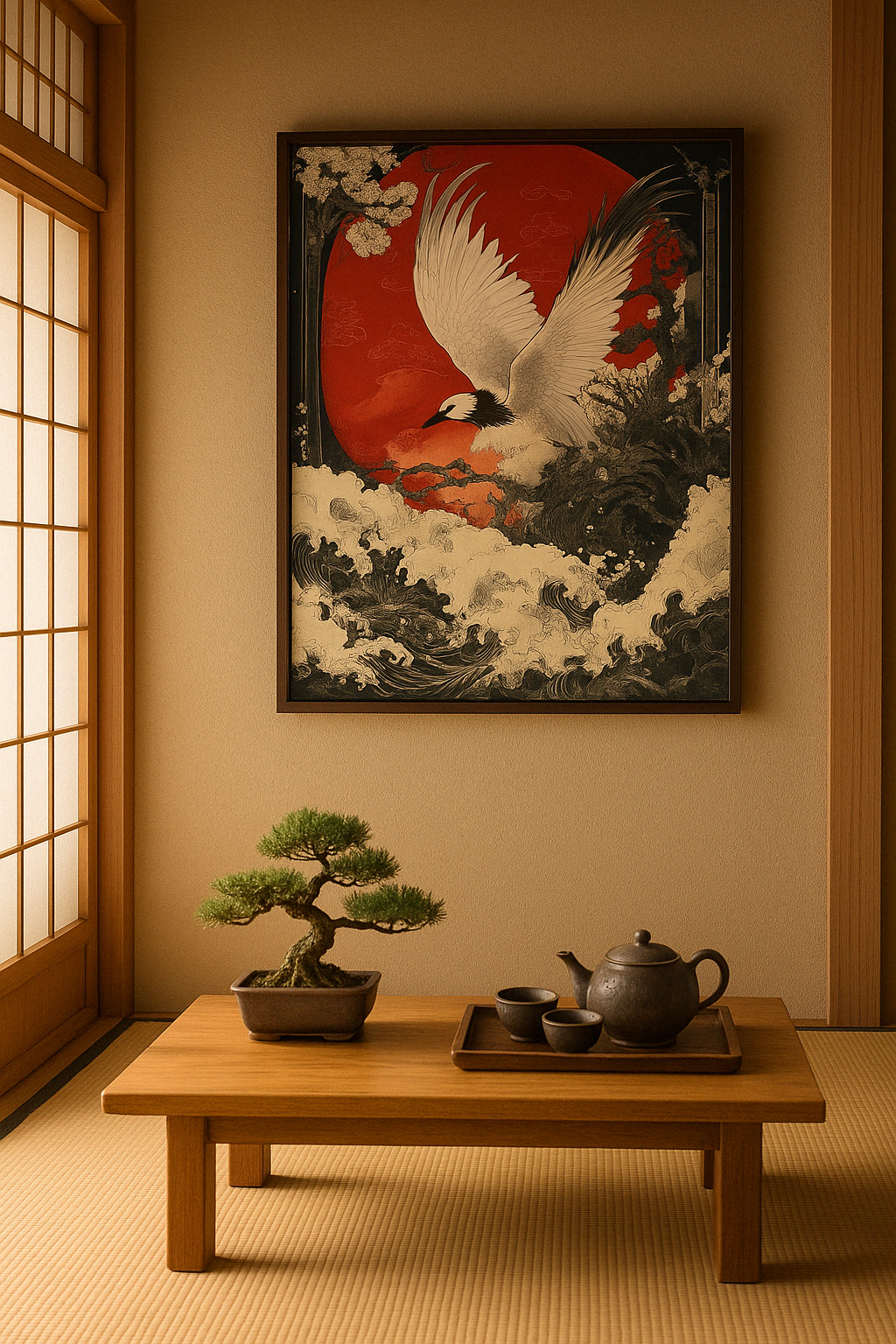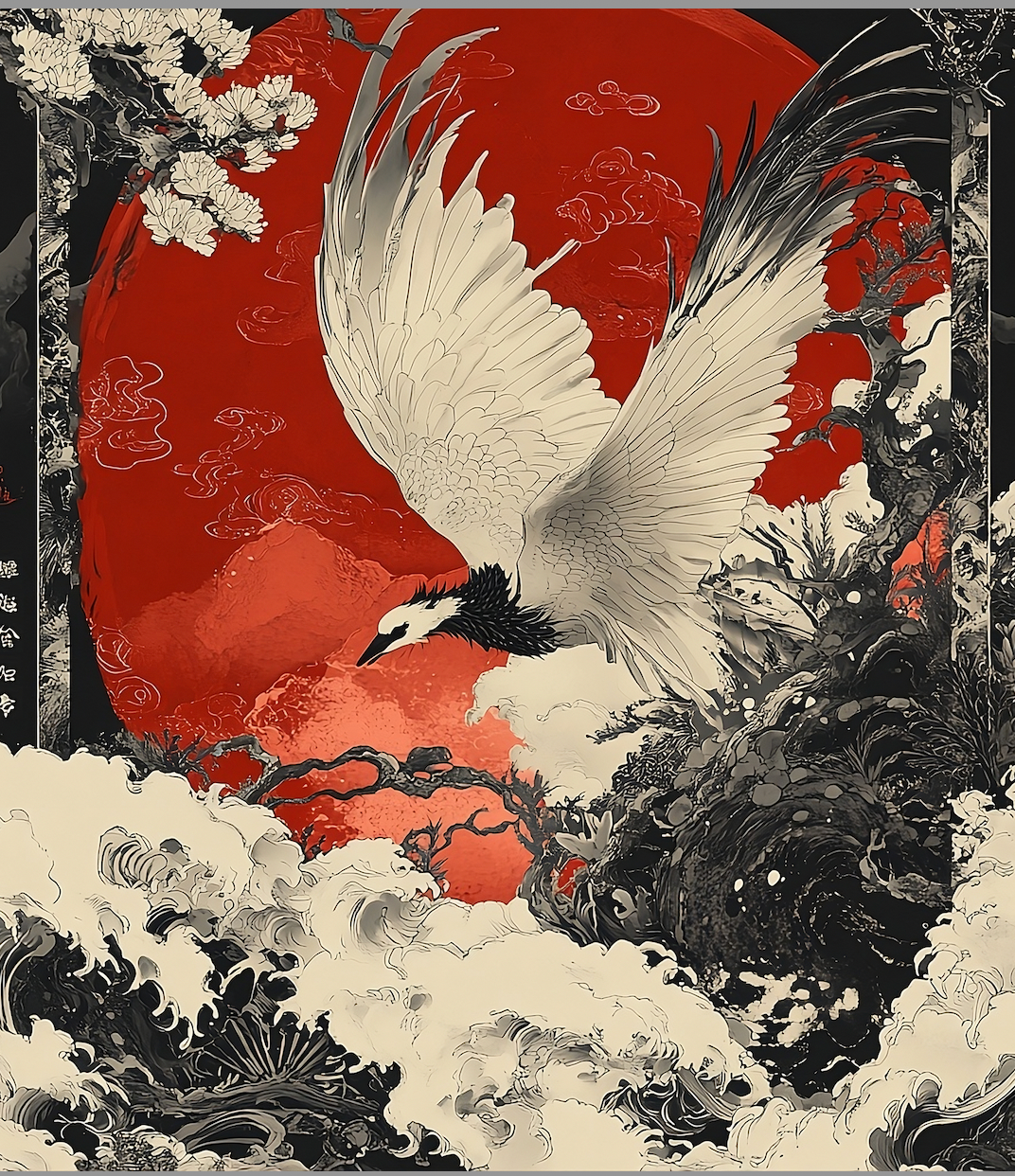 Crane Over Red Moon – Ukiyo-e x Surreal Ink Fusion