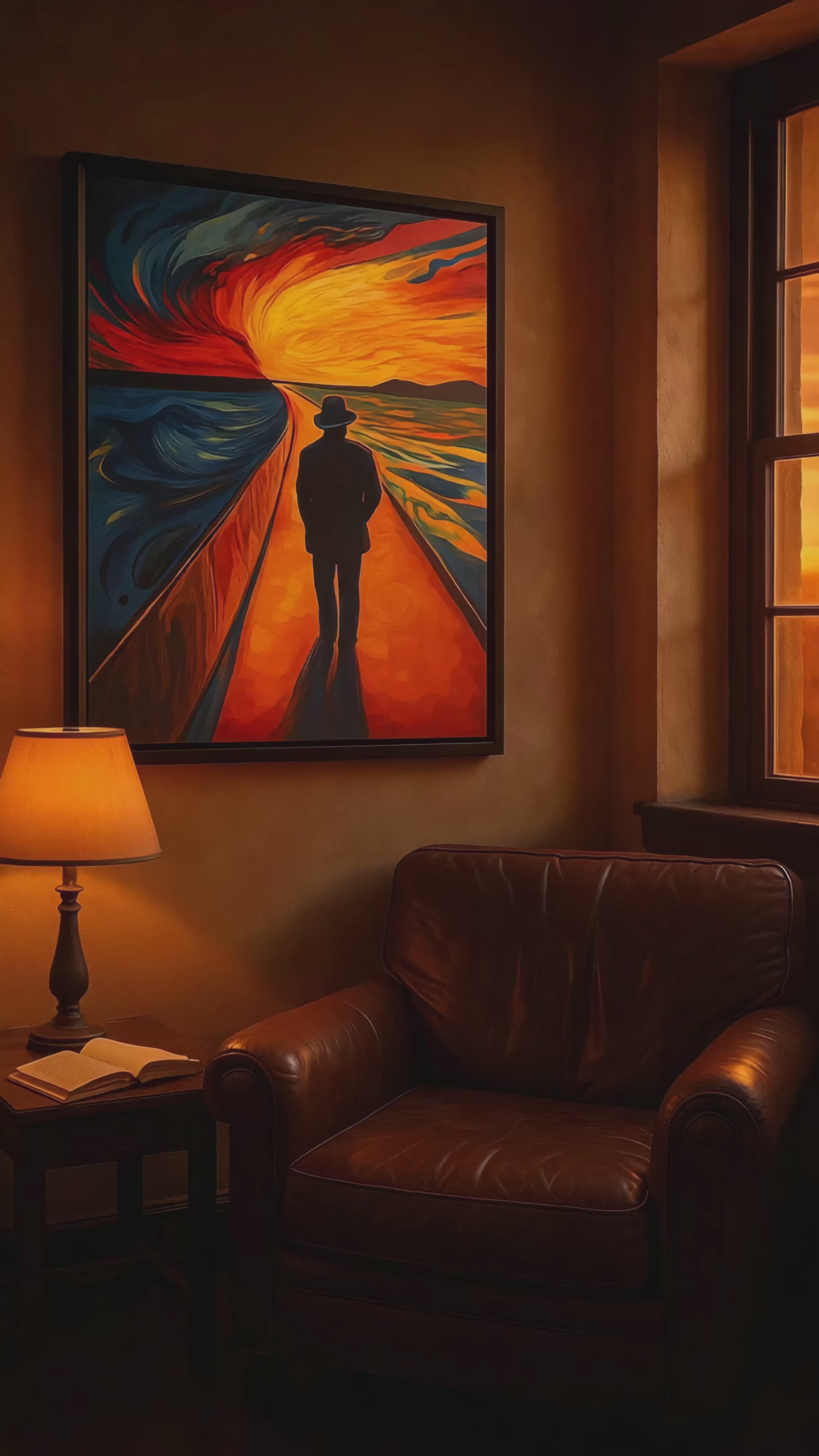 Step into The Outer Realm with The Last Path – a surreal visual blend of Edward Hopper’s solitude, Van Gogh’s swirling skies, and Dalí’s dreamlike abstraction. This museum-grade poster captures the moment between isolation and ignition — a journey through the subconscious, painted in fire and wave.