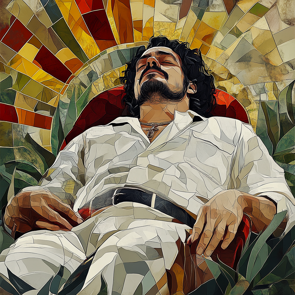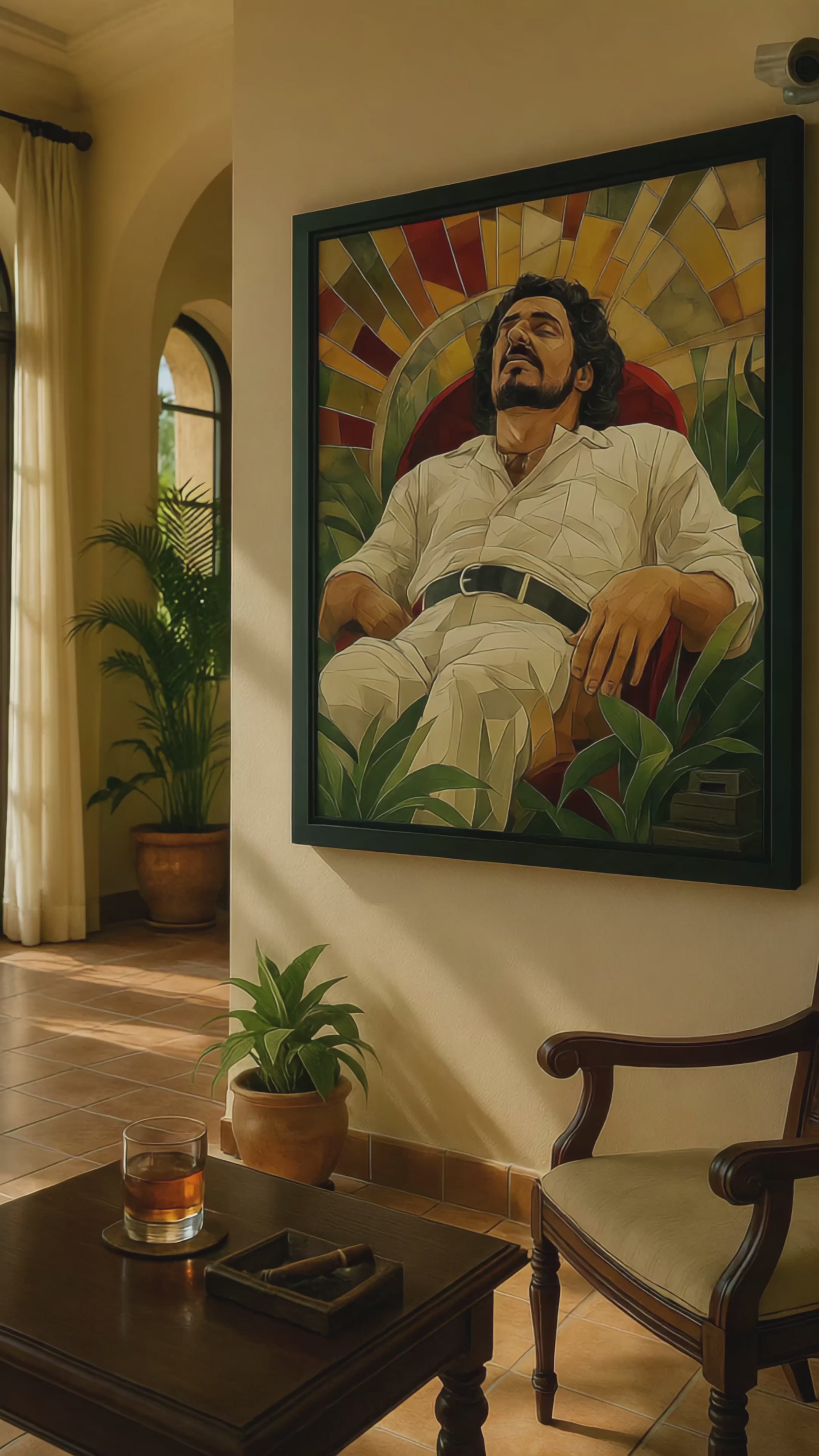 The Patron’s Throne captures the paradox of power — sunlit ease with an undercurrent of control. This original design blends mosaic realism with a narrative-rich backdrop, seated in a throne of leaves and legend. A piece that doesn’t whisper — it watches.